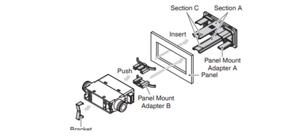 從后面推動面板安裝適配器B,直到顯示器固定到面板上。面板安裝適配器B的引腳與面板適配器部分C的缺口部分嚙合修復顯示。