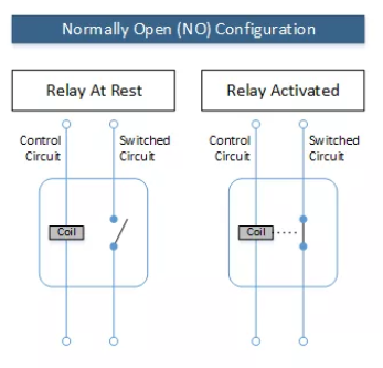 在圖1中,您可以看到在常開(NO)模式下的繼電器的圖示。在這種配置下,當沒有電壓施加到控制電路(繼電器位于圖像的其余部分)時,開關電路將斷開連接,并且電流將不會流過該連接。當您向控制電路施加適當的電壓時,繼電器中的電磁線圈將激活并拉開開關,使電流流過開關電路。