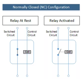 在常閉(NC)模式下,情況正好相反(如圖2所示)。 當繼電器處于靜止狀態(沒有電壓施加到控制電路)時,開關電路閉合,電流流過開關電路。 通過向控制電路施加適當的電壓來激活繼電器時,繼電器中的電磁線圈將激活并拉開開關,從而阻止流經開關電路的任何電流。 我不知道繼電器內部的工作原理。