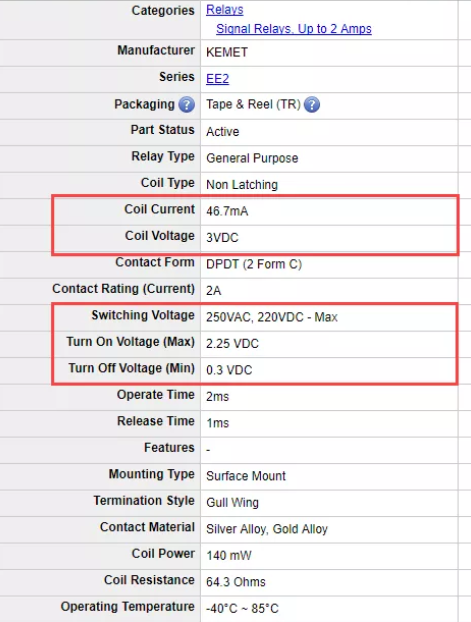 舉個例子。圖3顯示了DigiKey網站上的隨機繼電器的產品屬性。圖中突出顯示的線圈值描述了繼電器消耗的電流以及可以與繼電器一起使用的最大電壓。在這種情況下,它是3V繼電器,因此您需要確保您的項目可以提供3伏電壓來觸發繼電器,否則它將無法正常工作。