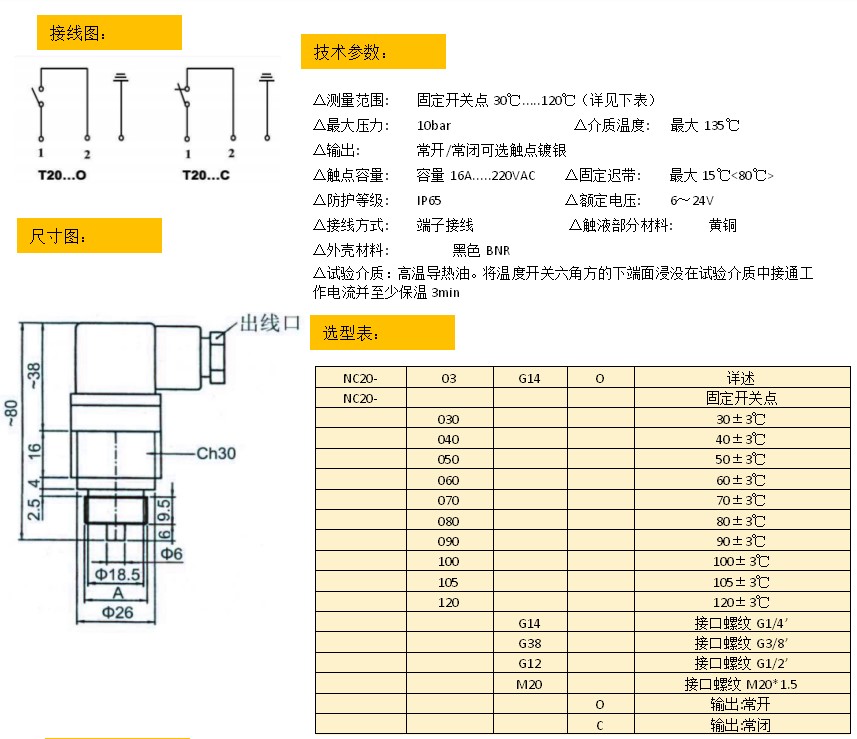 原理結構: NC20系列采用雙金屬片原理,當溫度達到設定值時,繞制成環性彎曲狀的雙金屬片的端受熱膨脹觸發內置機械裝置,開關動作。 NC20系列溫度開關可滿足液壓,潤滑,傳統系通中對于溫度控制的不同要求,用于檢測溫度是否超過最高限或最低限。特點: NC20與介質接觸部分全部采用黃銅材料,接口螺紋有G1/4,G1/2,M20×1.5三種可供選擇,溫度范圍:30℃............120℃。應用: NC20系列溫度開關可滿足液壓,潤滑,傳統系通中對于溫度控制的不同要求,用于檢測溫度是否超過最高限或最低限。